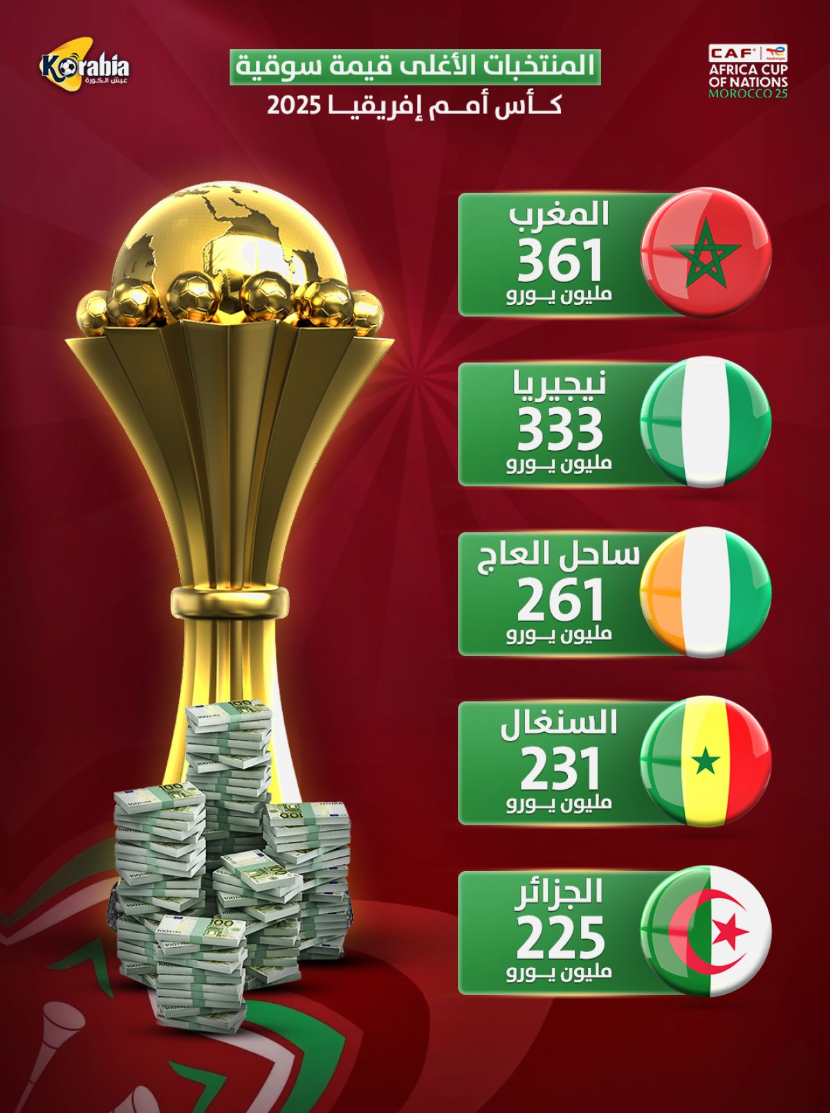 ويتصدر المنتخب المغربي قائمة الفرق الأعلى قيمة سوقية بإجمالي 361 مليون يورو، يليه المنتخب النيجيري بـ 333 مليون يورو، ثم كوت ديفوار بـ 261 مليون يورو، والسنغال بـ 231 مليون يورو، والجزائر 225 مليون يورو.