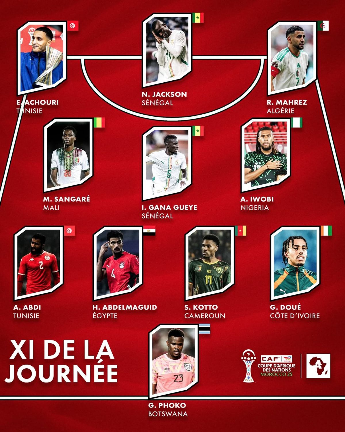 أعلن الاتحاد الأفريقي لكرة القدم، عن التشكيلة المثالية للجولة الأولى من دور المجموعات ببطولة كأس الأمم الأفريقية 2025.