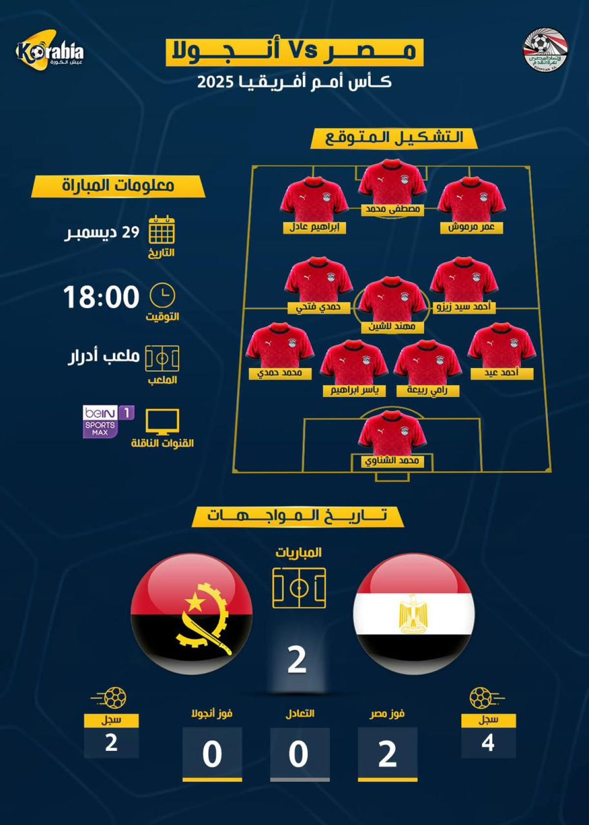 يلتقي منتخب مصر الأول لكرة القدم، مع نظيره منتخب أنجولا، في اللقاء الذي يجمع بينهما في بطولة كأس الأمم الإفريقية 2025.