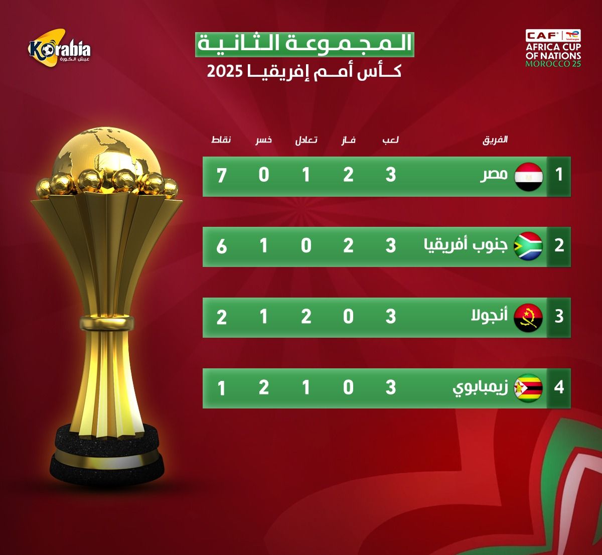 أُسدل الستار على مواجهات المجموعة الثانية ببطولة كأس الأمم الإفريقية 2025، بعد نهاية الجولة الثالثة التي تضم منتخبات مصر وجنوب أفريقيا وأنجولا وزيمبابوي.