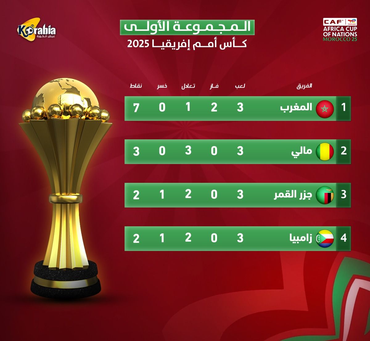 أُسدل الستار على مباريات المجموعة الأولى بدور المجموعات من بطولة كأس أمم أفريقيا 2025، والتي شهدت فوز المغرب على زامبيا وتعادل مالي وجزر القمر ضمن مباريات الجولة الثالثة.