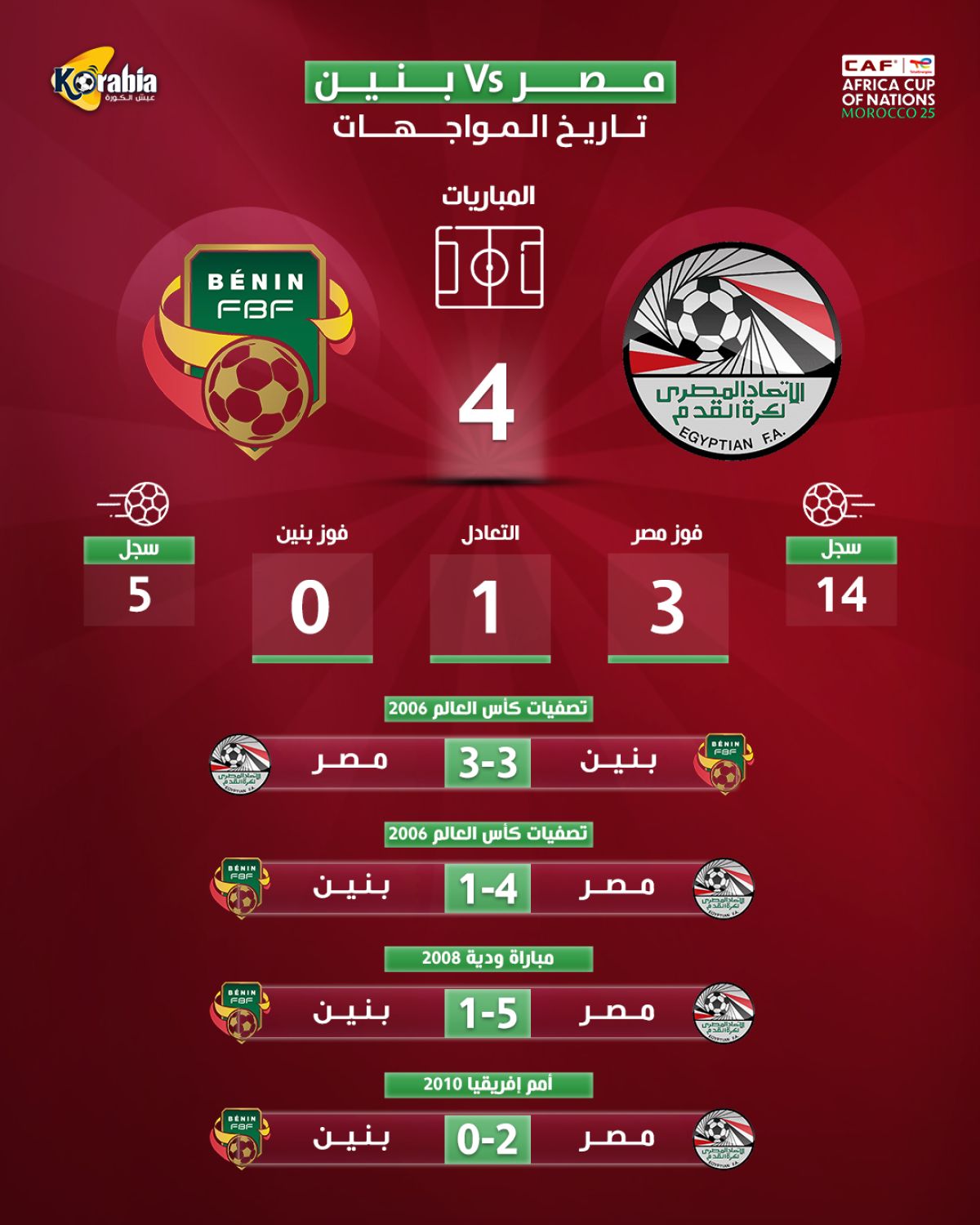 تاريخ مواجهات مصر وبنين قبل مواجهة دور الـ16 في أمم إفريقيا