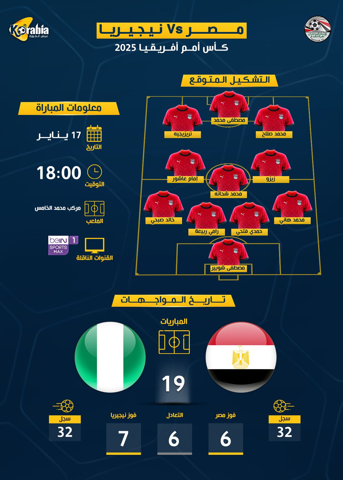 يواجه منتخب مصر الأول لكرة القدم، نظيره منتخب نيجيريا، مساء اليوم السبت، في اللقاء الذي يجمع بينهما في بطولة كأس أمم أفريقيا 2025.