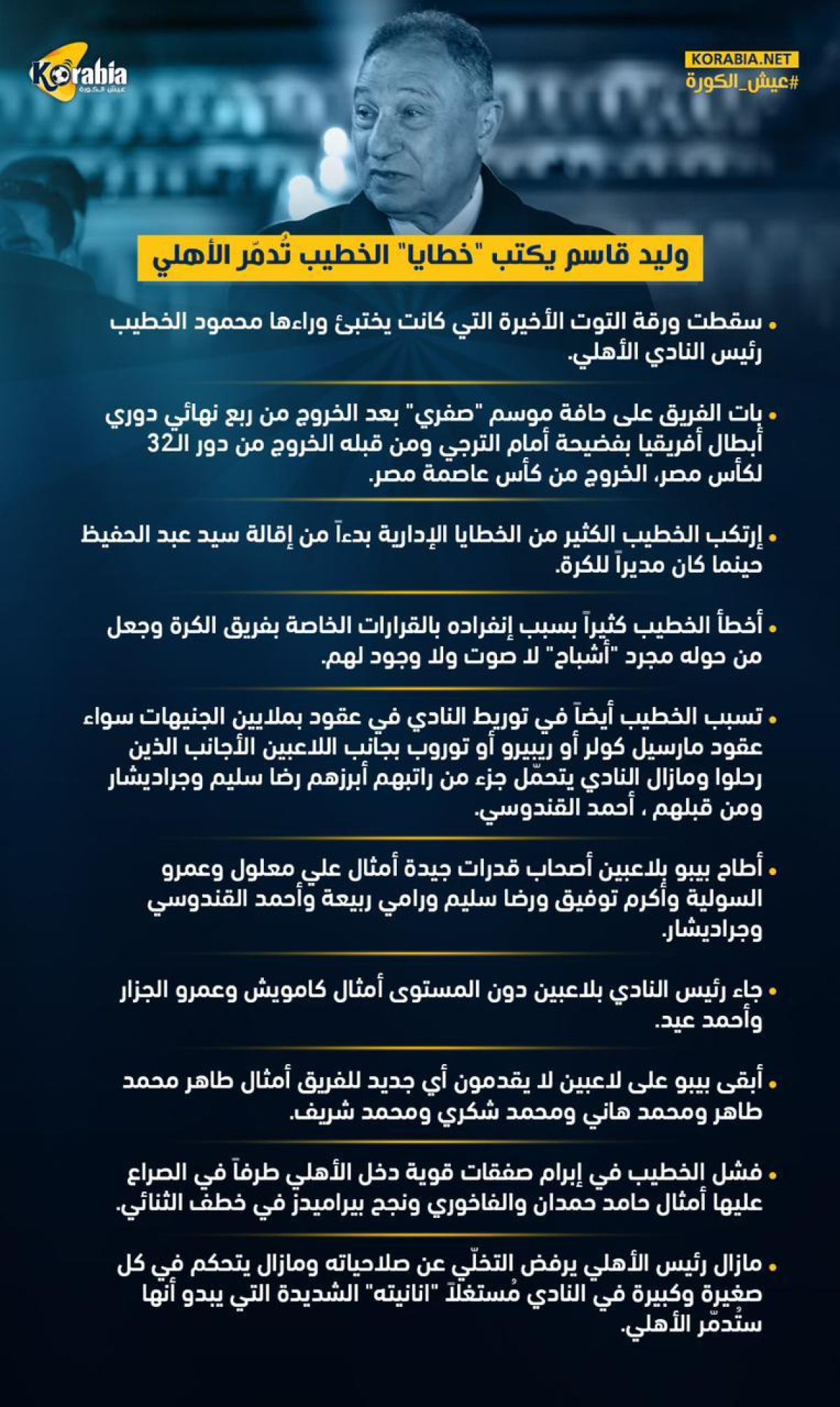 الفشل الذريع الذي يعاني منه الأهلي ، مسئول عنه في المقام الأول ، محمود الخطيب فهو الذي إرتكب الكثير من الإخطاء _وربما الخطايا_ الإدارية القاتلة بدءاً من إقالة سيد عبد الحفيظ حينما كان مديراً للكرة بعد نهاية موسم تاريخي للأهلي حصد خلاله الفريق خمس بطولات محلية وأفريقية ، وجاء بـ خالد بيبو مديراً للكرة ، ثم أطاح به وجاء بمحمد رمضان ثم رحل الأخير وجاء بعده وليد صلاح الدين.